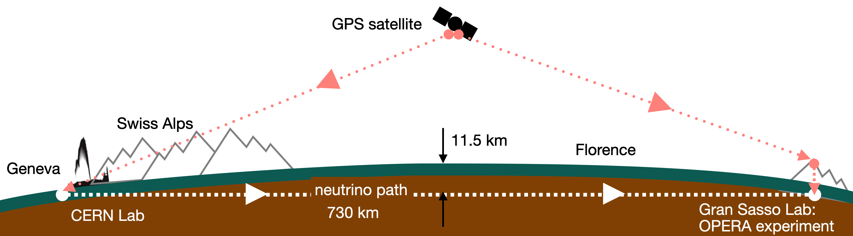 To do that, OPERA had a sophisticated GPS system that measured times in Geneva and times in the mountain at a precision better than ±0.000000010 seconds (\(\pm10\) nanoseconds). The figure shows the GPS satellite communication with CERN and then to the top of the Gran Sasso mountain…and then down through the mountain almost 8000 meters to the electronics of the OPERA experiment.