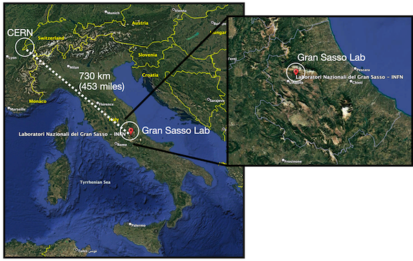 The neutrinos are received after they’ve traveled 730 km from CERN, through a cord of the Earth. The laboratory in Italy is inside of a large mountain about 1400 meters high.
